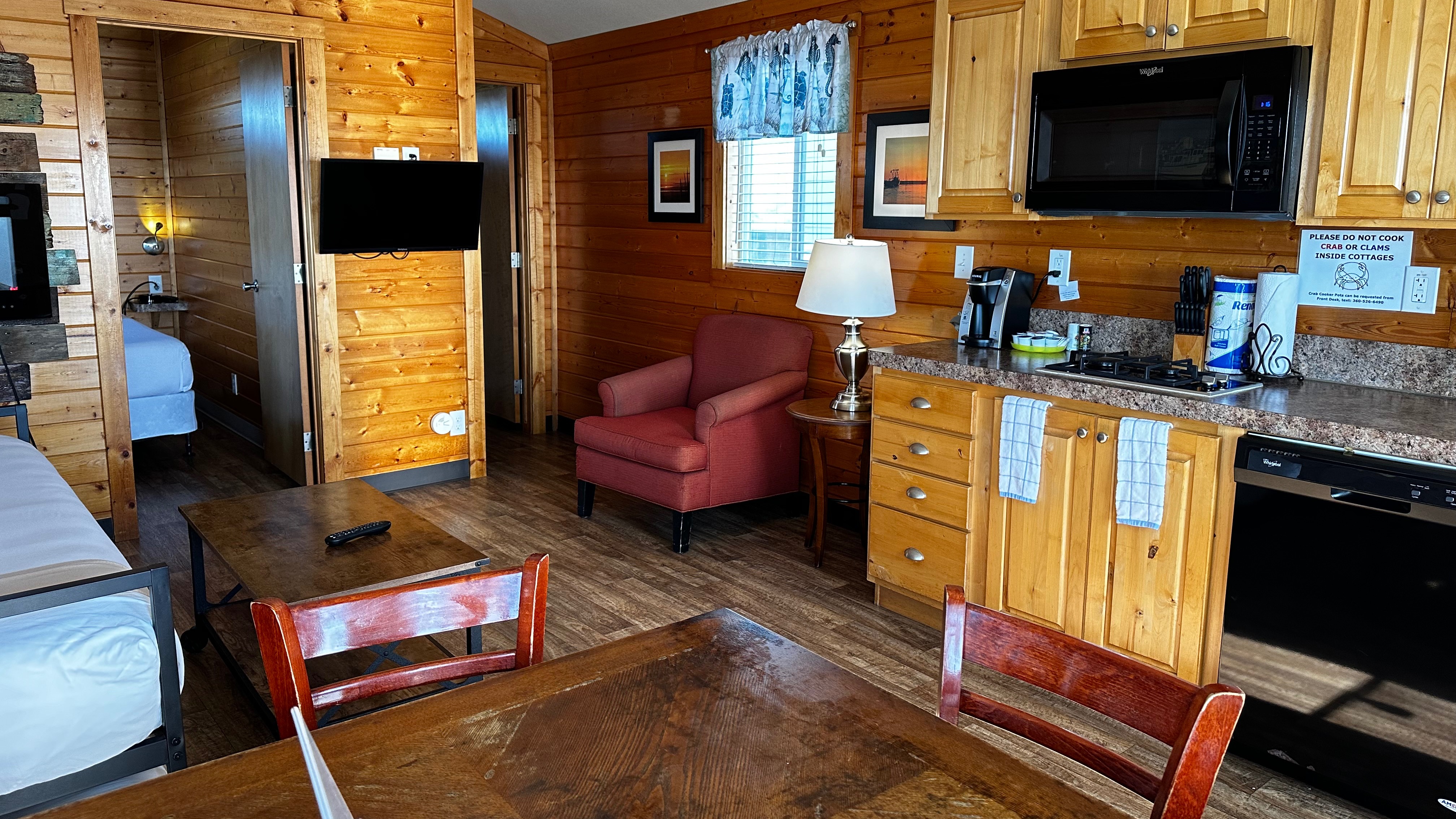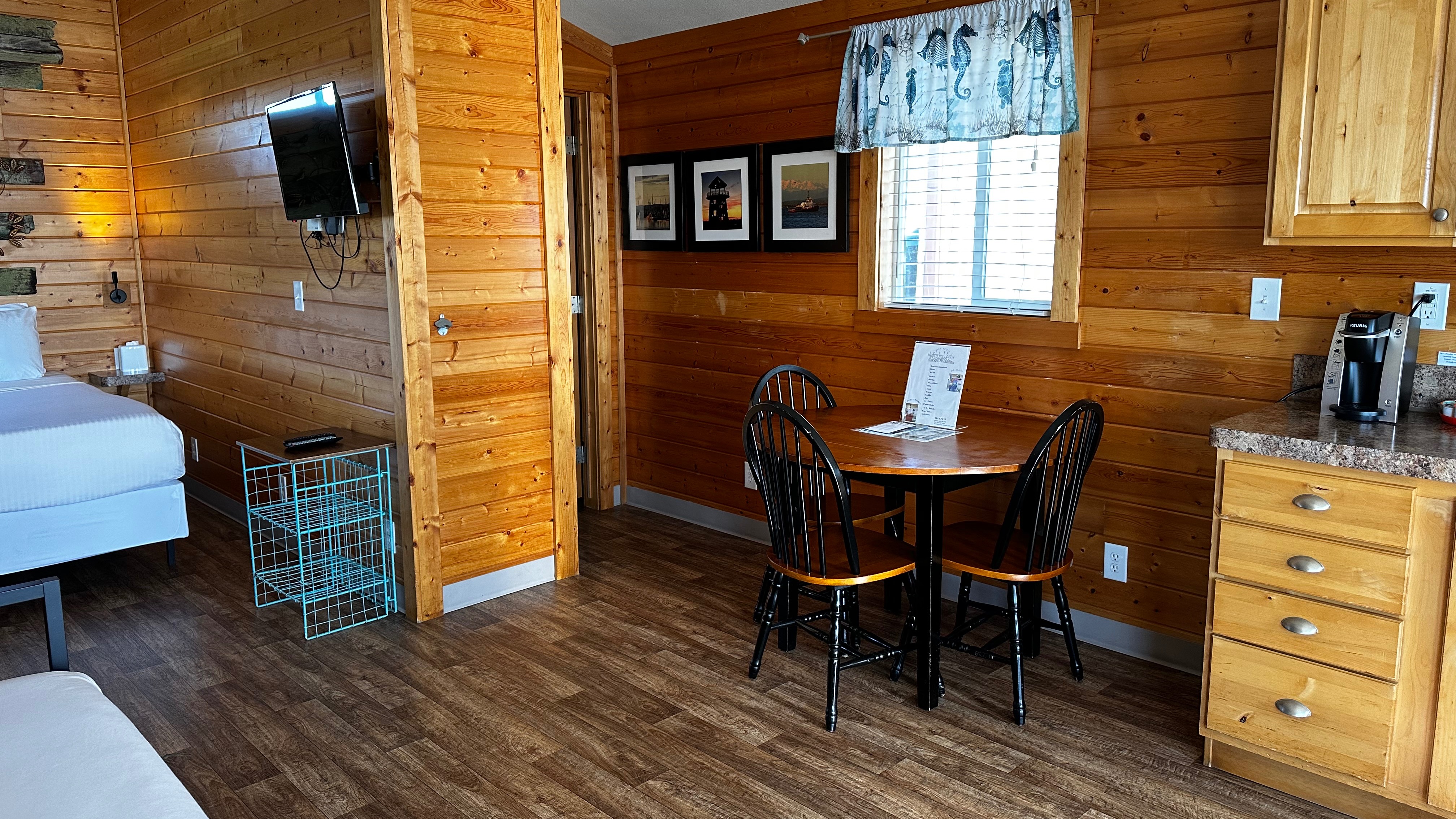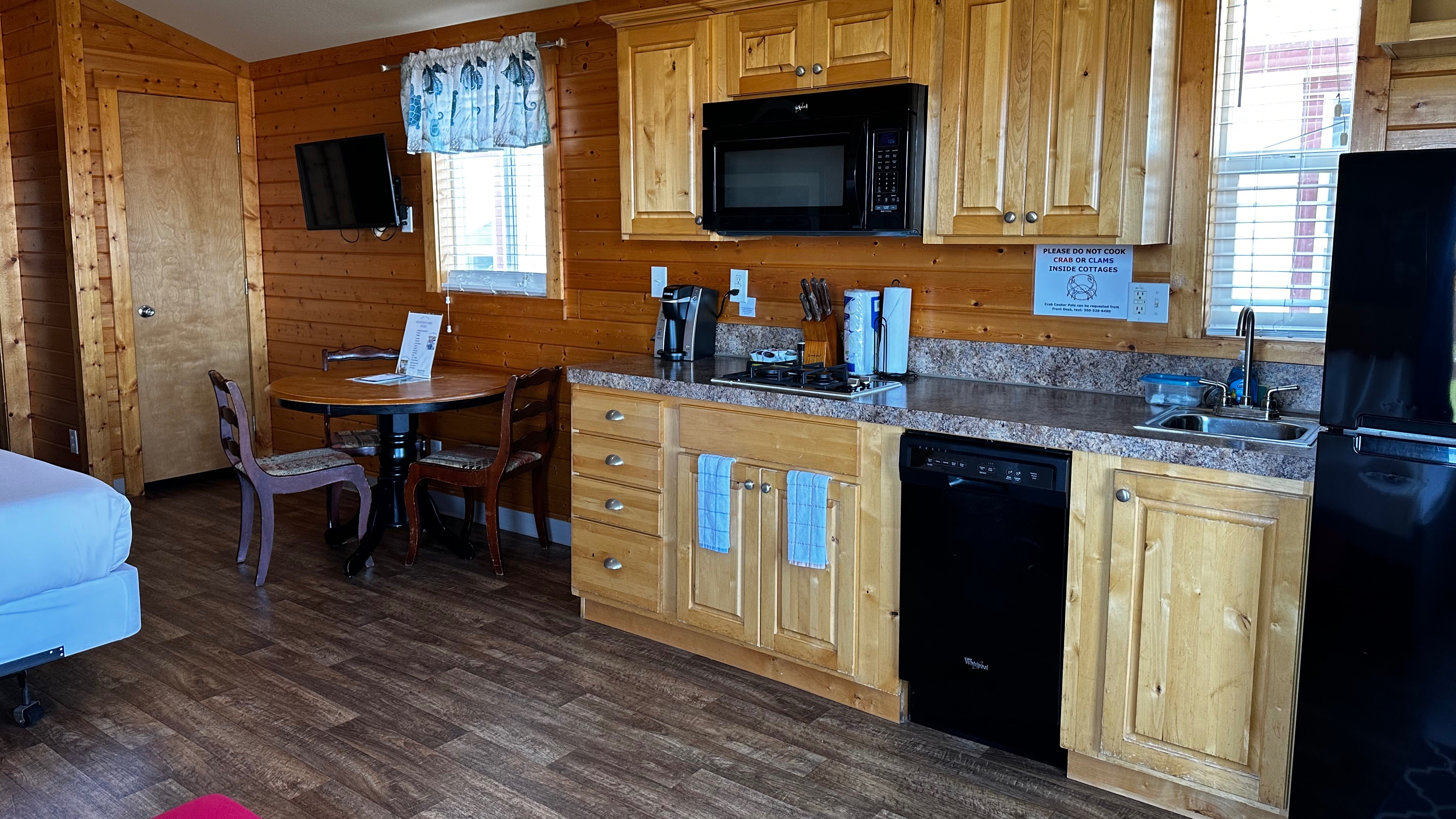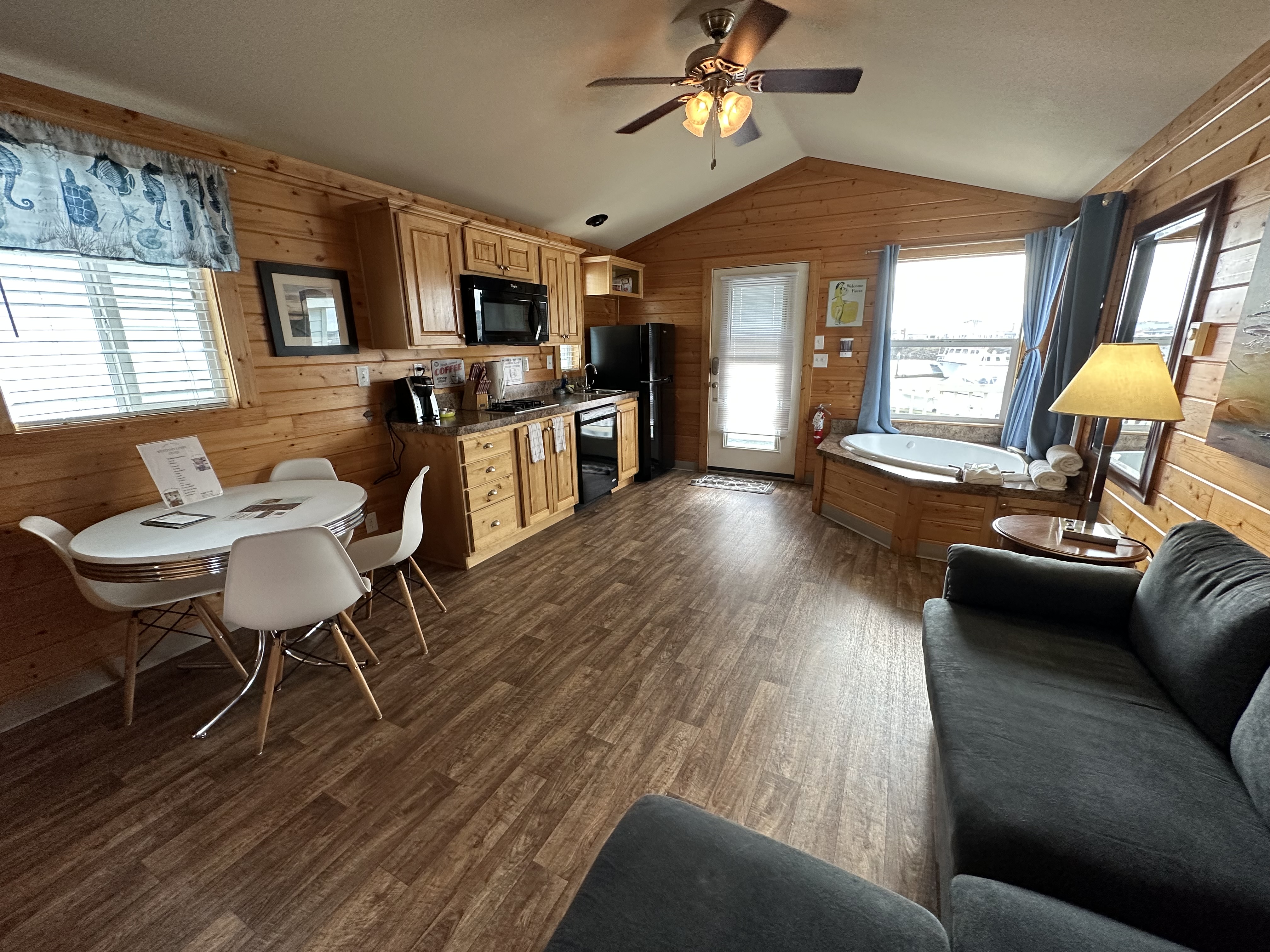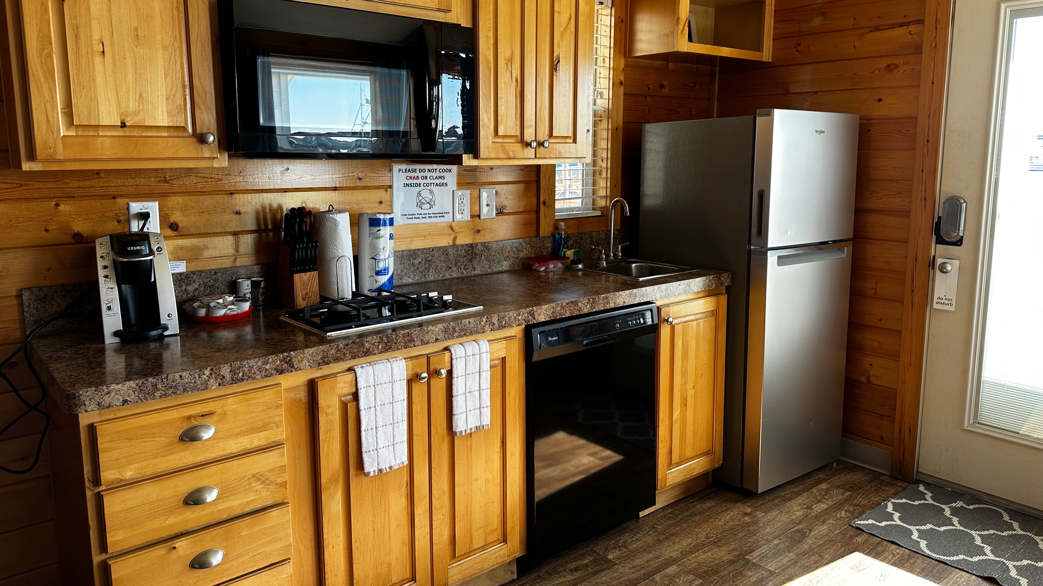 Incredibly spacious and yet cozy each waterfront cottage is uniquely designed to accommodate a variety of preferences and sleeping situations. Each cottage features a full kitchenette with a full-sized refrigerator, toaster, coffeemaker, blender, and dishwasher. Every one of our cottages has a spectacular view of the water. Some are on the bay side, while the others face the marina. You will enjoy a private porch with two easy chairs. Switch on your electric fireplace for instant ambience and warmth or use the outdoor fire pit as you watch the sunset over the ocean.