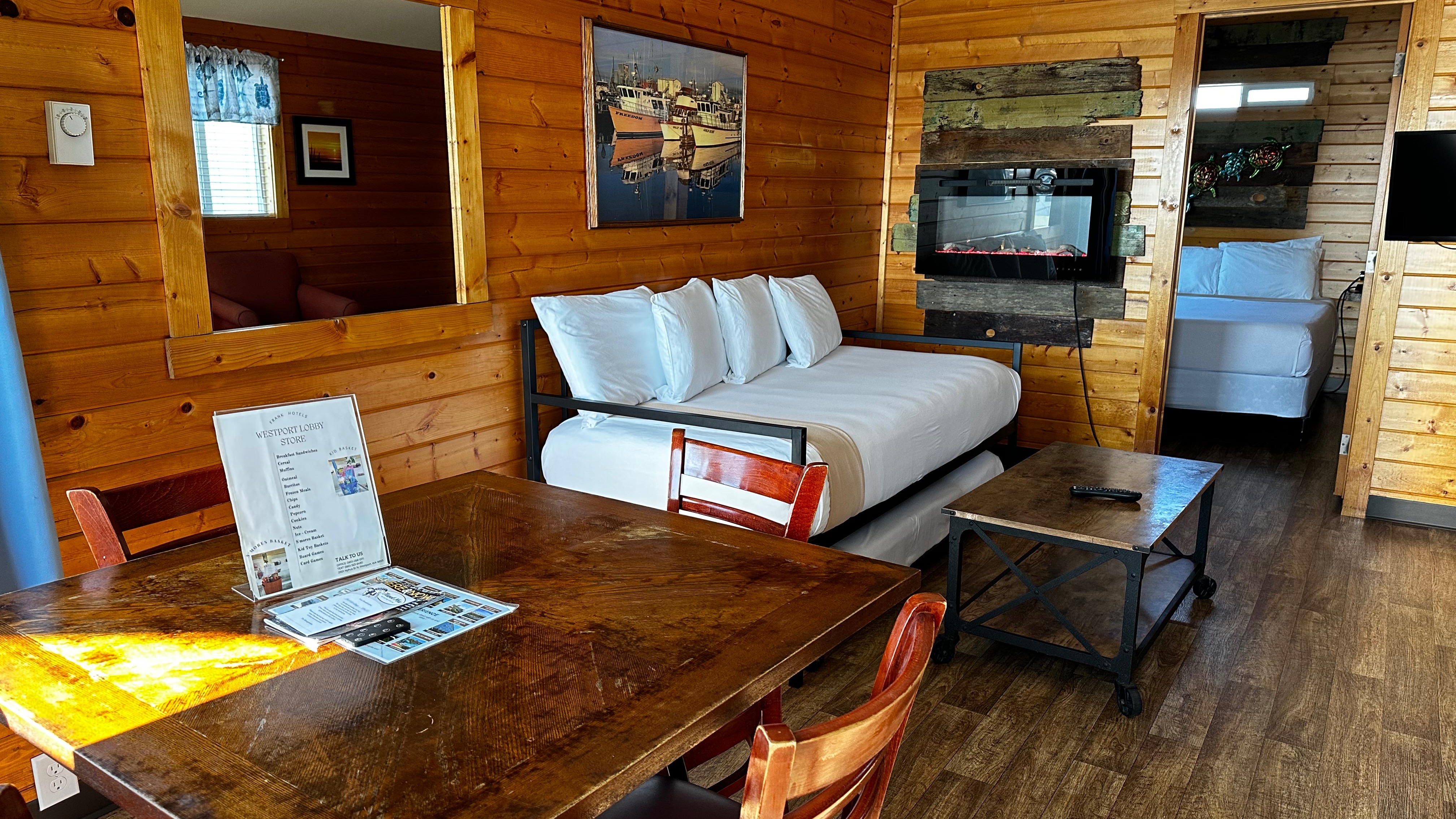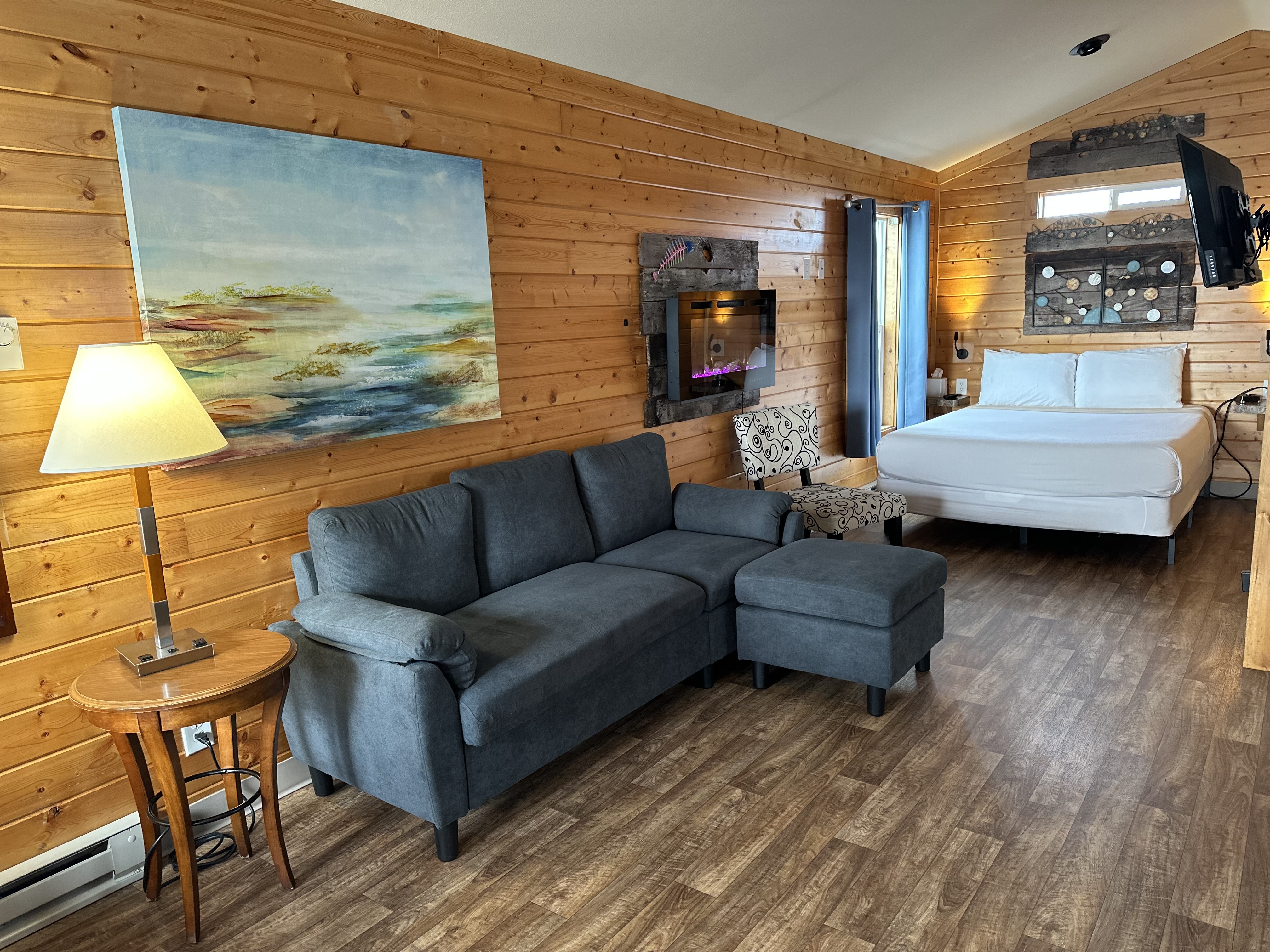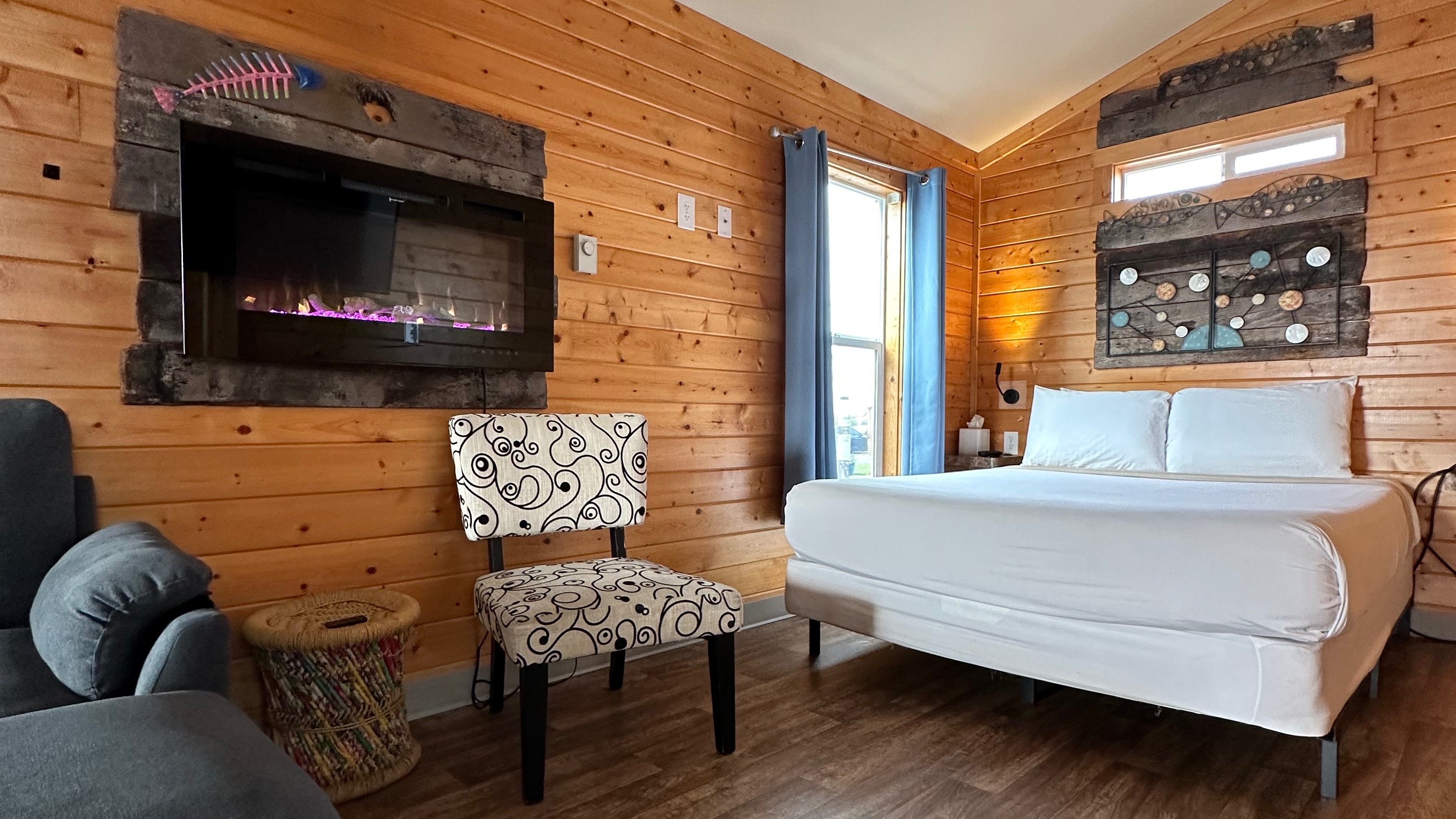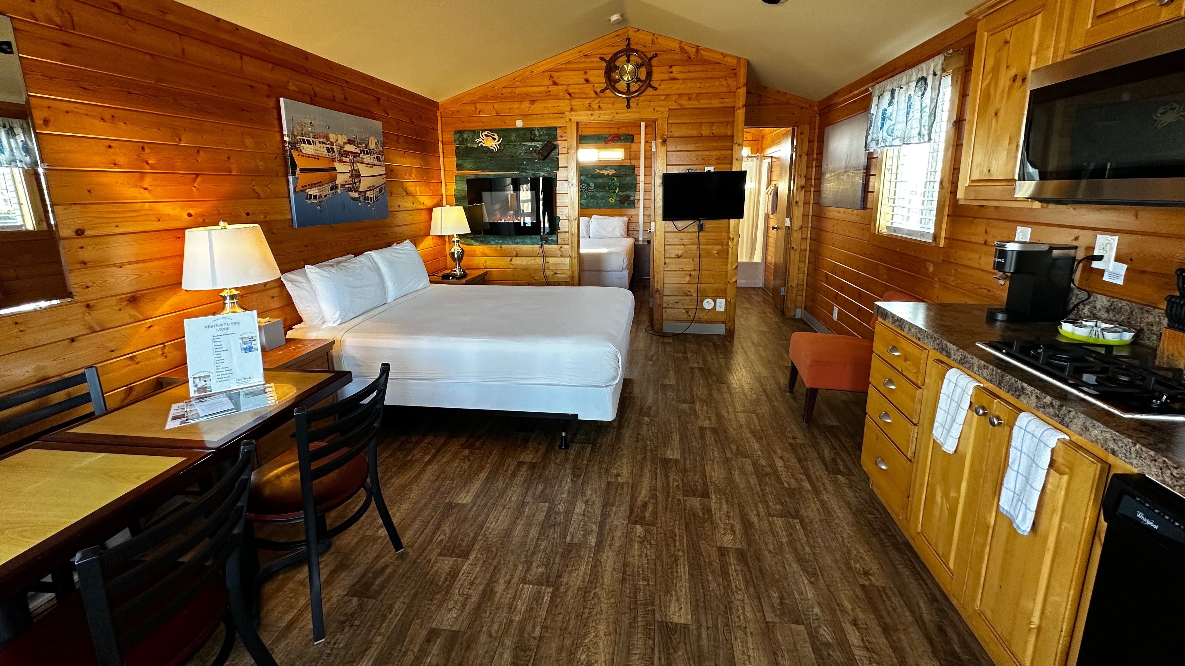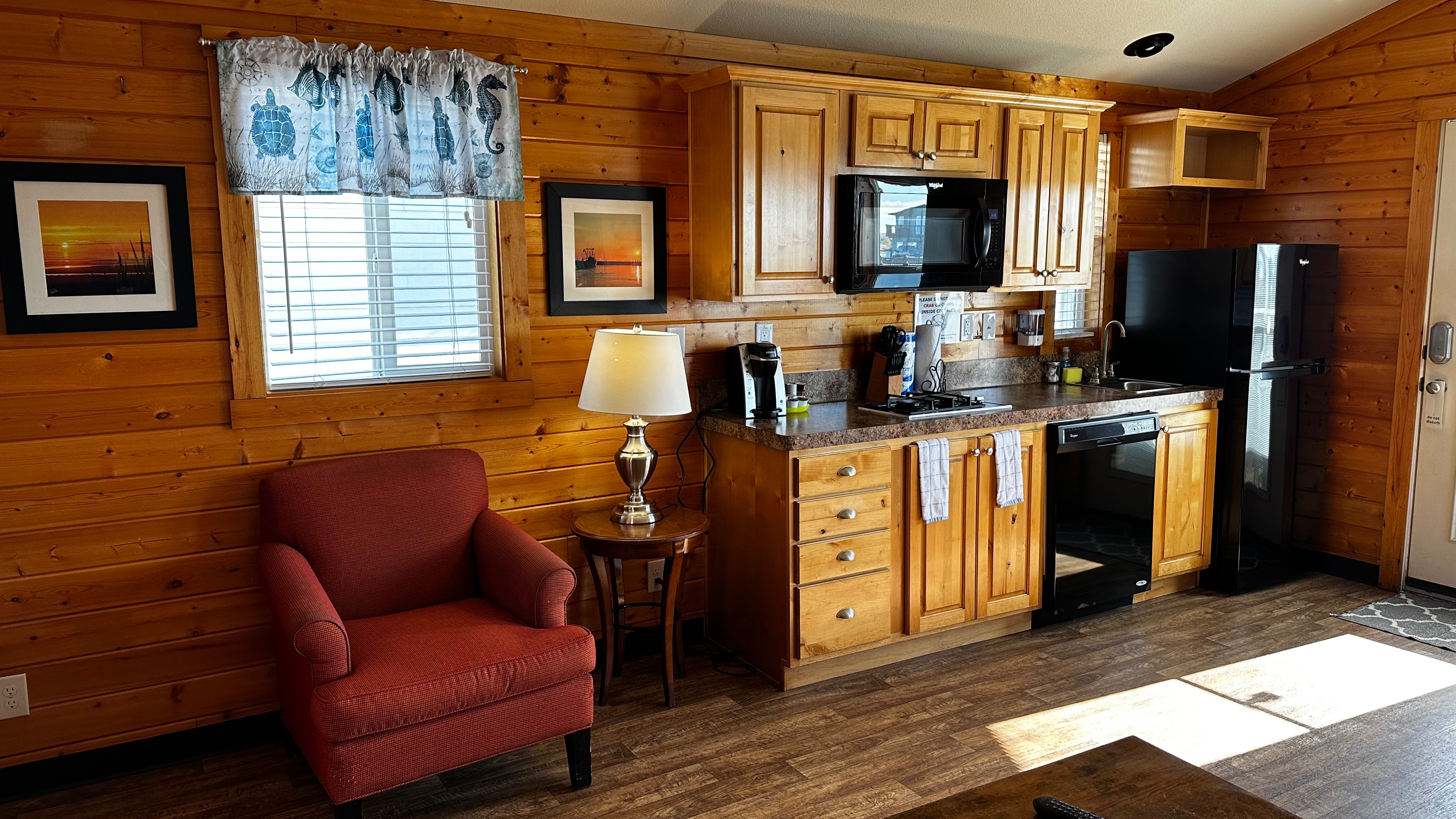 Incredibly spacious and yet cozy each waterfront cottage is uniquely designed to accommodate a variety of preferences and sleeping situations. Each cottage features a full kitchenette with a full-sized refrigerator, toaster, coffeemaker, blender, and dishwasher. Every one of our cottages has a spectacular view of the water. Some are on the bay side, while the others face the marina. You will enjoy a private porch with two easy chairs. Switch on your electric fireplace for instant ambience and warmth or use the outdoor fire pit as you watch the sunset over the ocean.