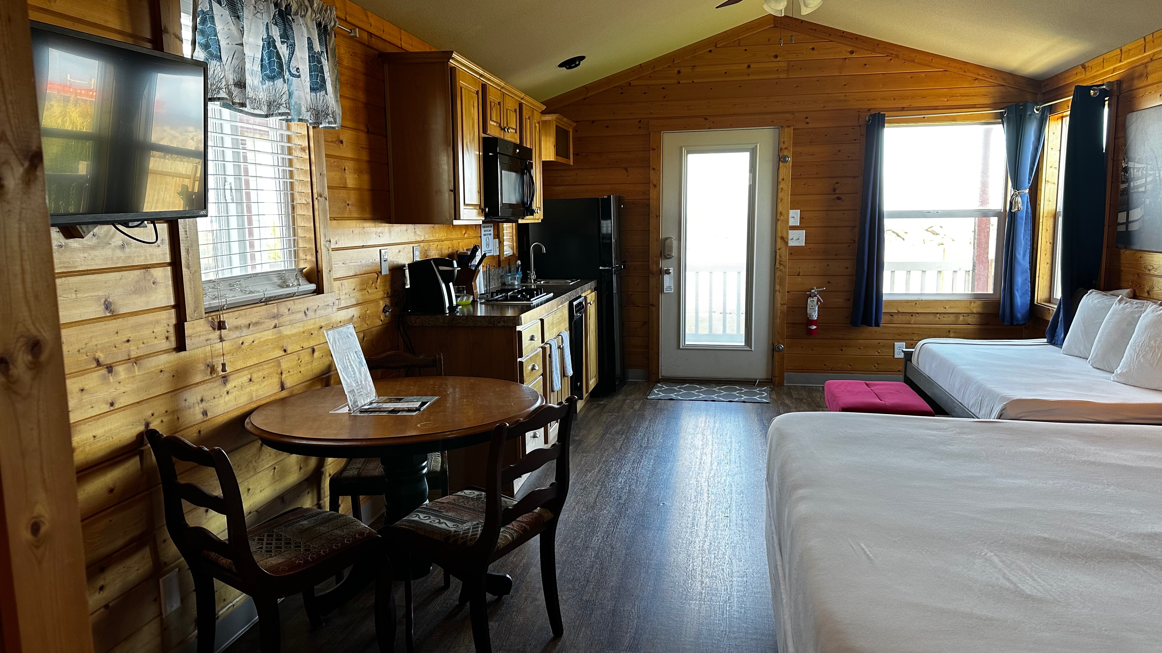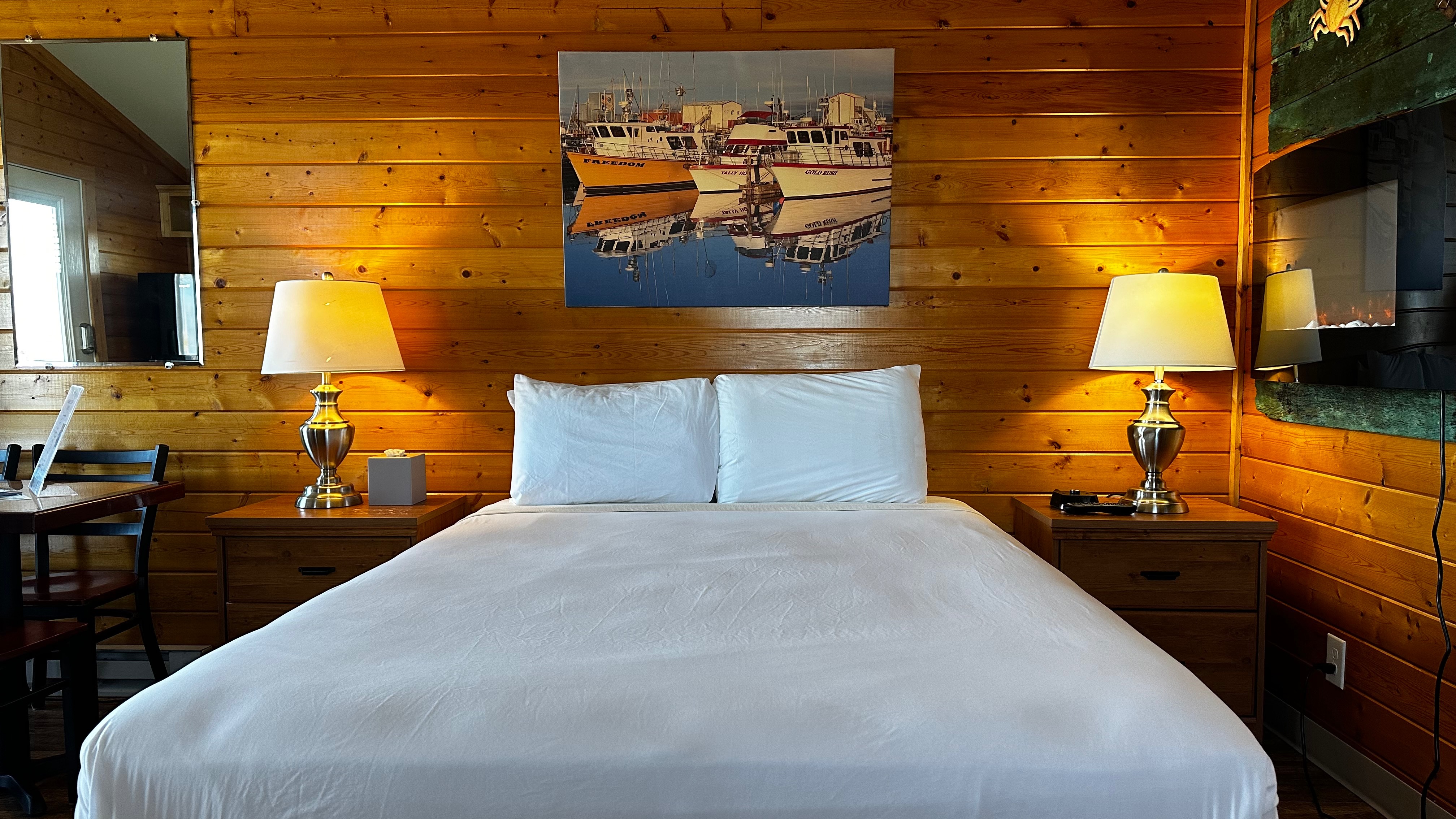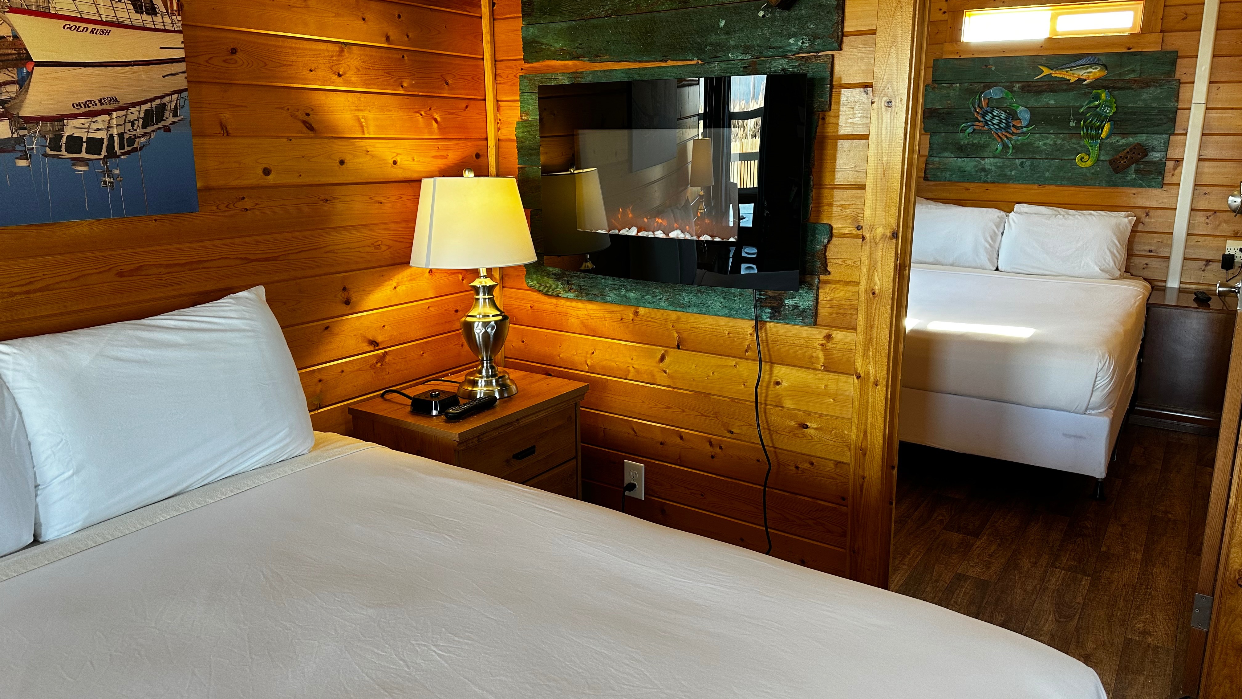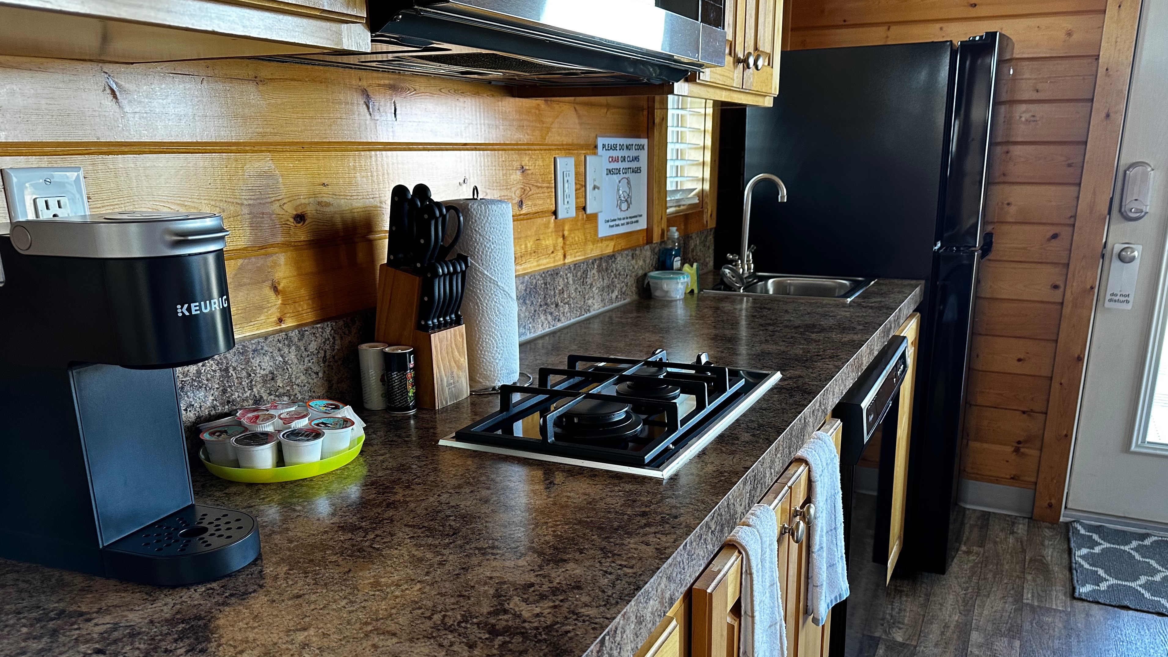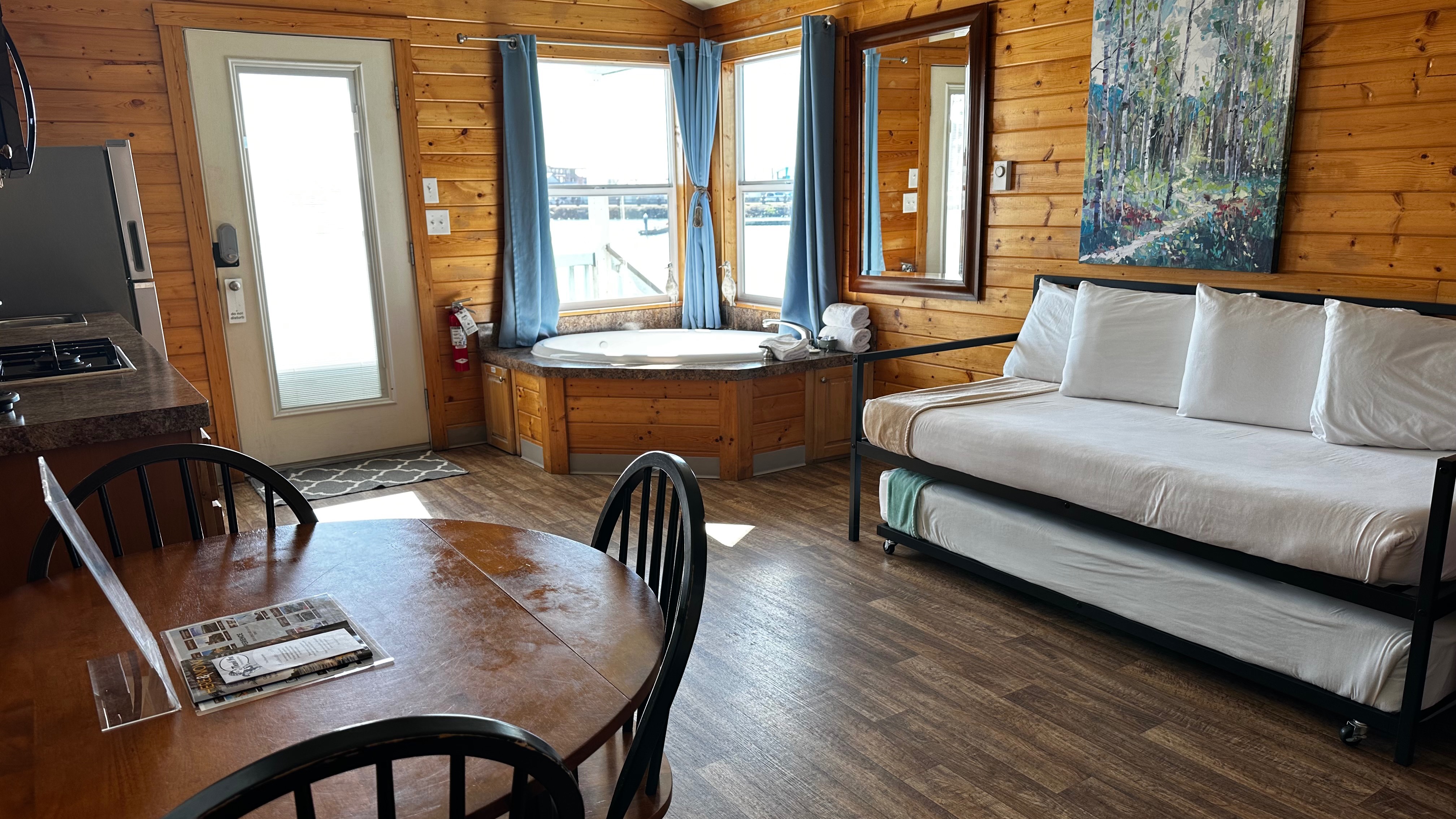 Incredibly spacious and yet cozy each waterfront cottage is uniquely designed to accommodate a variety of preferences and sleeping situations. Each cottage features a full kitchenette with a full-sized refrigerator, toaster, coffeemaker, blender, and dishwasher. Every one of our cottages has a spectacular view of the water. Some are on the bay side, while the others face the marina. You will enjoy a private porch with two easy chairs. Switch on your electric fireplace for instant ambience and warmth or use the outdoor fire pit as you watch the sunset over the ocean.
